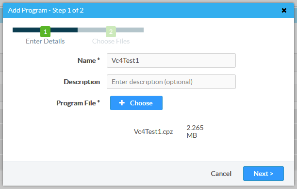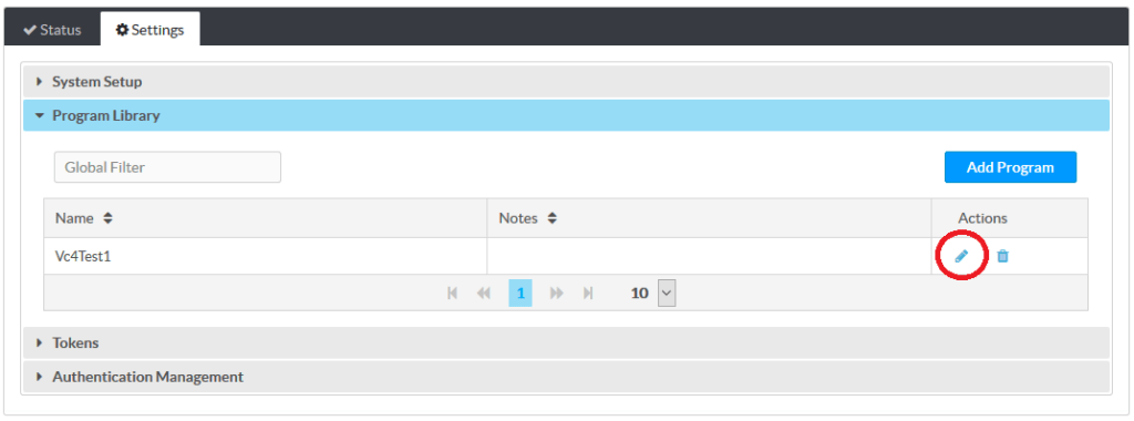 First we need to add a new program to VC-4. From the Status page, select Add Program from the Actions menu: