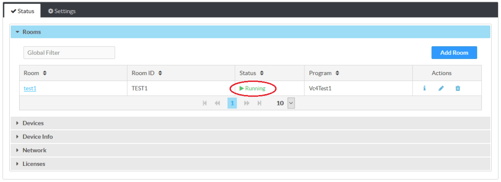 When you’re done, click Add. The new room will be created, our program will be started, and we’ll see that it’s running on the Status page: