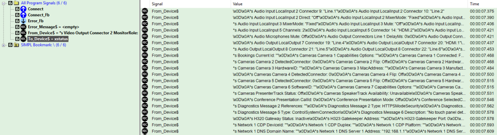 And there you go: we can send and receive commands from our codec. This is still very rough at this point. In the next part, we’ll work on creating a new class in our library to abstract away some of the details about talking to a Cisco codec. Then we can spend part four fleshing out what our module does and using it in a REAL program.