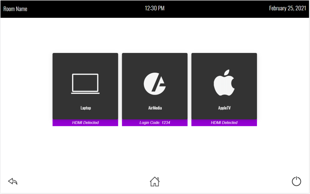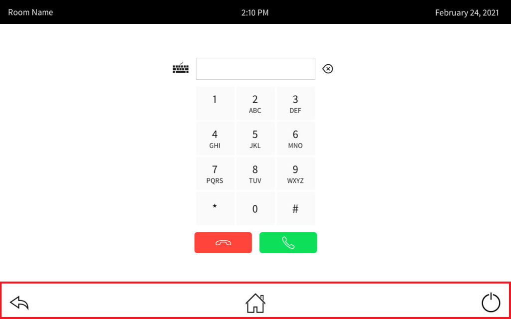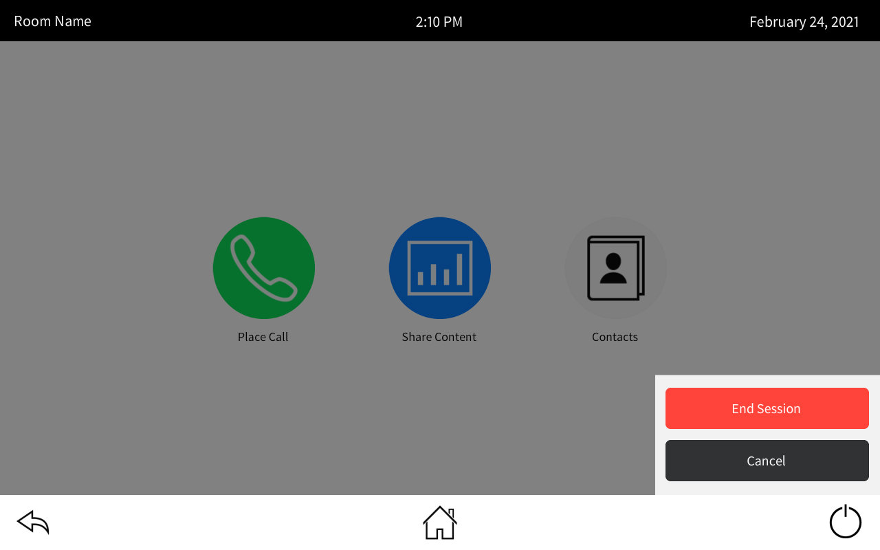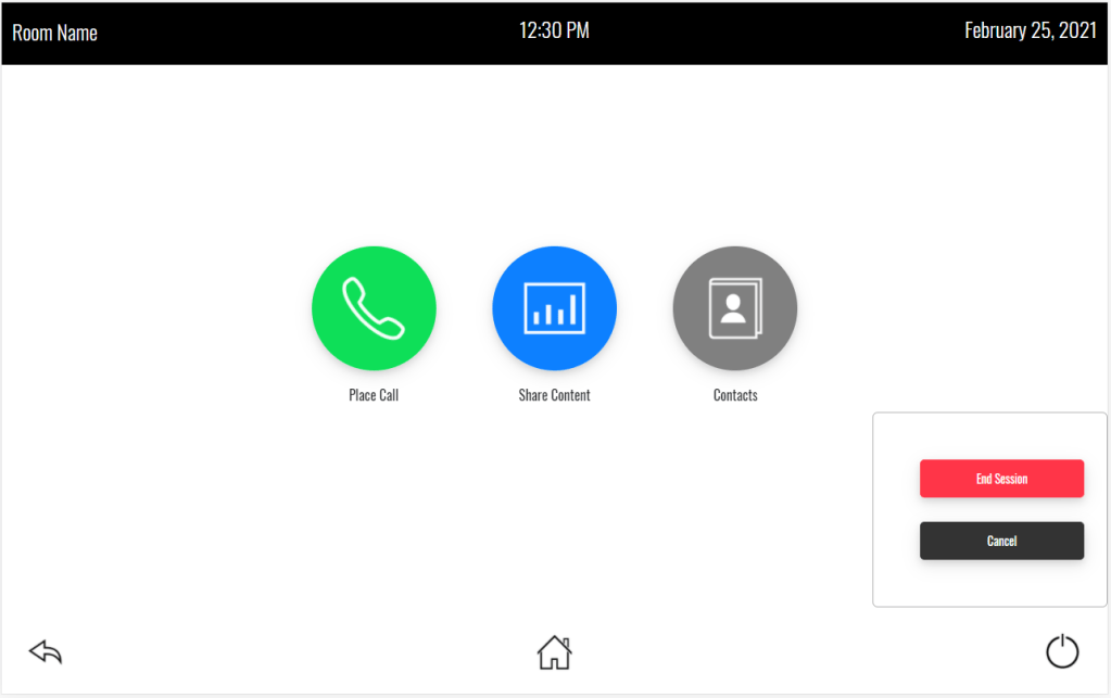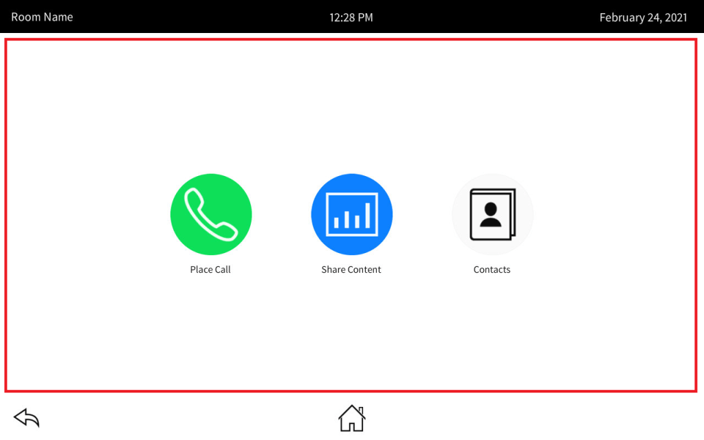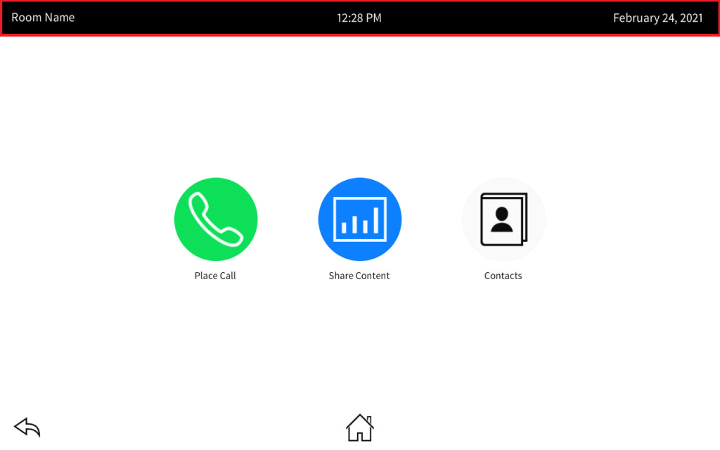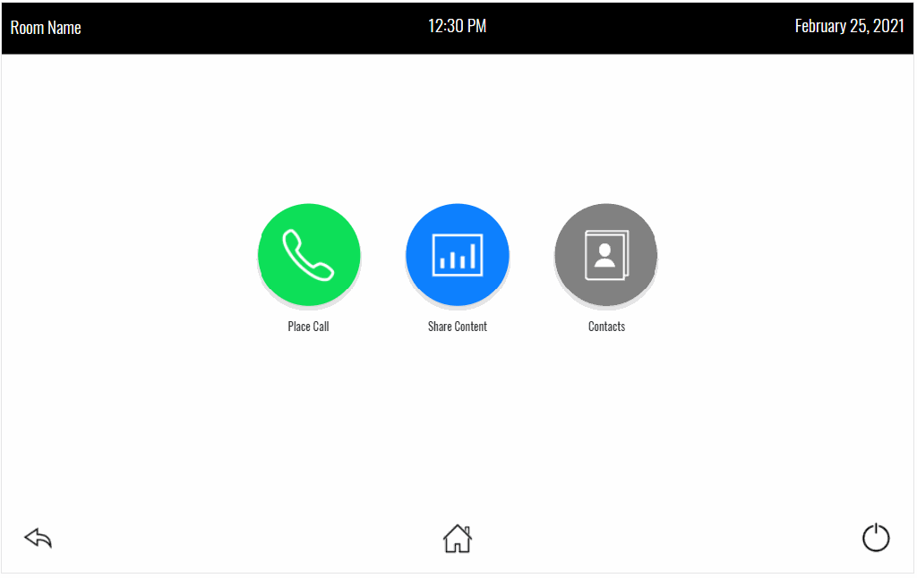 The idea is we’ll have the room name, current date, and time at the top of the page. The bottom has navigation buttons to get us around. The Home page has the various activities we can use this room for: place a call, share content, look up contacts. We have a keypad (or keyboard) we can use to place calls. There are three content sources in the system. If video sync is detected it will tell us, or in the case of the AirMedia, it will give us the login code. Contacts let us add, modify, and dial contacts.