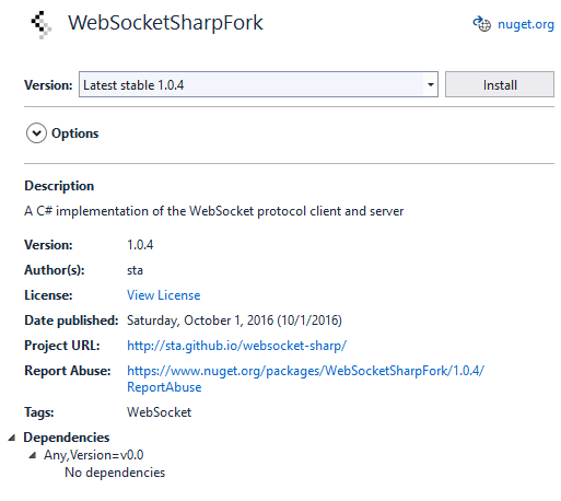 First, we need to manage the packages for our project. Right-click the project name in Solution Explorer and select Manage NuGet Packages. Select the Browse tab and type in websocket-sharp. You should see WebSocketSharpFork by sta appear in the list. Select it and click Install:
