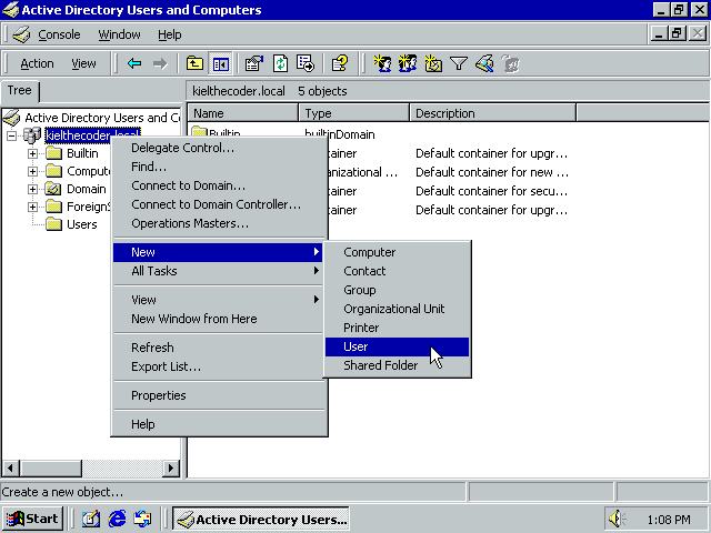 I really don’t want to login as Administrator everywhere, so let’s create a new domain user. Open the Active Directory Users and Computers snap-in and add a New User: