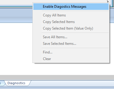 Build Workspace again and send to the controller. The next part will require you to be persistant: while the controller is rebooting and restarting our program, we need to try and enable diagnostic messages. The easiest way I’ve found to do this is to have the Diagnostics tab open, right-click on it and select Enable Diagnostic Messages. If the controller is still booting, you’ll get an error message. Keep trying! Eventually it will connect and you can watch the startup messages fly by.