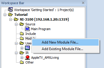 To add a new module to our program, right-click Module in the Workspace explorer and select Add New Module File.