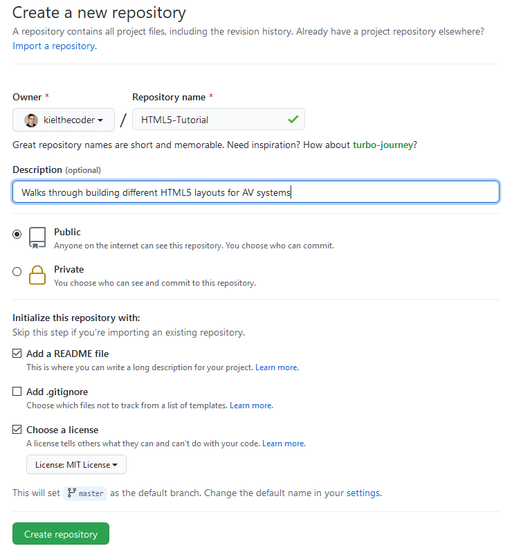 I’m going to show you all the steps this time, even the housekeeping I do behind the scenes. First I head over to GitHub and create a new repository: