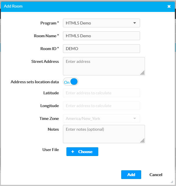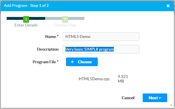 Lets load our SIMPL# Pro program to VC-4. From the Actions menu, select Add Program. Browse to the HTML5Demo.cpz file. Give the program a name (and optionally) a description: