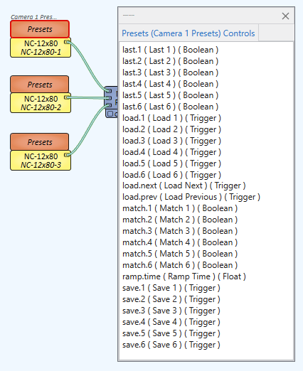 OK, we’ve got our cameras, our presets, and our named controls. But how to we save presets to the active camera? With 6 presets per camera, that gives us 12 buttons (Load/Save) per camera, for a total of 36 buttons we need to consider: