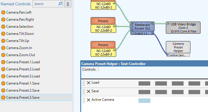 We could keep track of the active camera outside of Q-SYS and remember which set of named controls we need to interact with, but that still means dragging 36 buttons to the Named Controls window and giving them all names. What happens if we add another camera? Now we need to add 12 more Named Controls for that one. It feels like there is a better way to approach this!