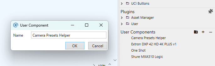 Drag the whole Text Controller block over to the User Components and you can save it with a name. Now you can quickly drop this into any design where you might have to control cameras from Crestron, AMX, etc.