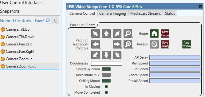 For this example, we’ll say we have another control system that will be handling the UI. We need to give names to all the controls we want to expose. Open up the USB Video Bridge block and assign names to all the PTZ controls: