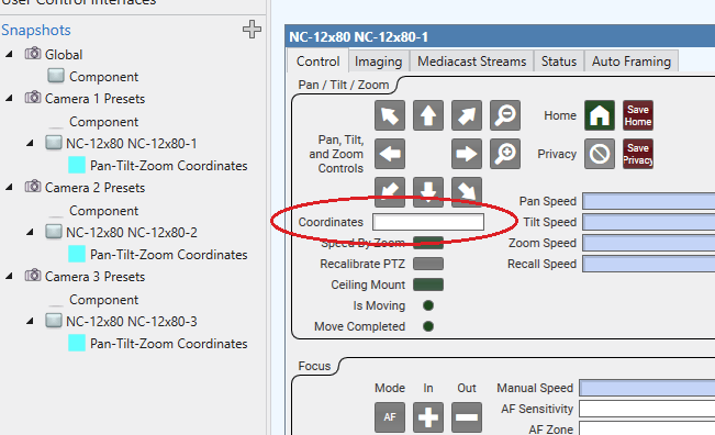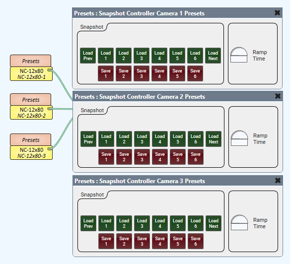Now, we need to open each camera block and drag the coordinates into the corresponding snapshot. Isn’t that clever? We save/recall the camera coordinates and that’s the preset! Of course, we could grab any number of camera attributes and save them as well (backlight compensation, focus, auto-framing, etc). It’s so flexible, it blows my mind. Where was I? Oh yeah, make sure you have at least this saved in your snapshot banks: